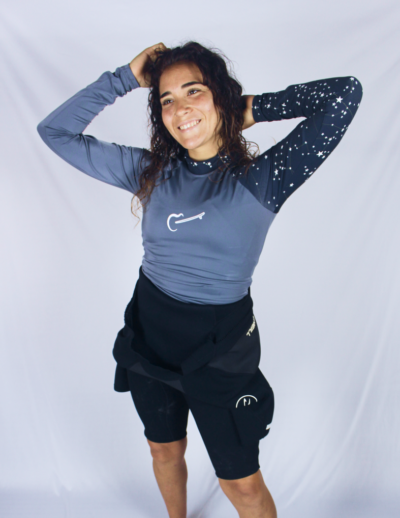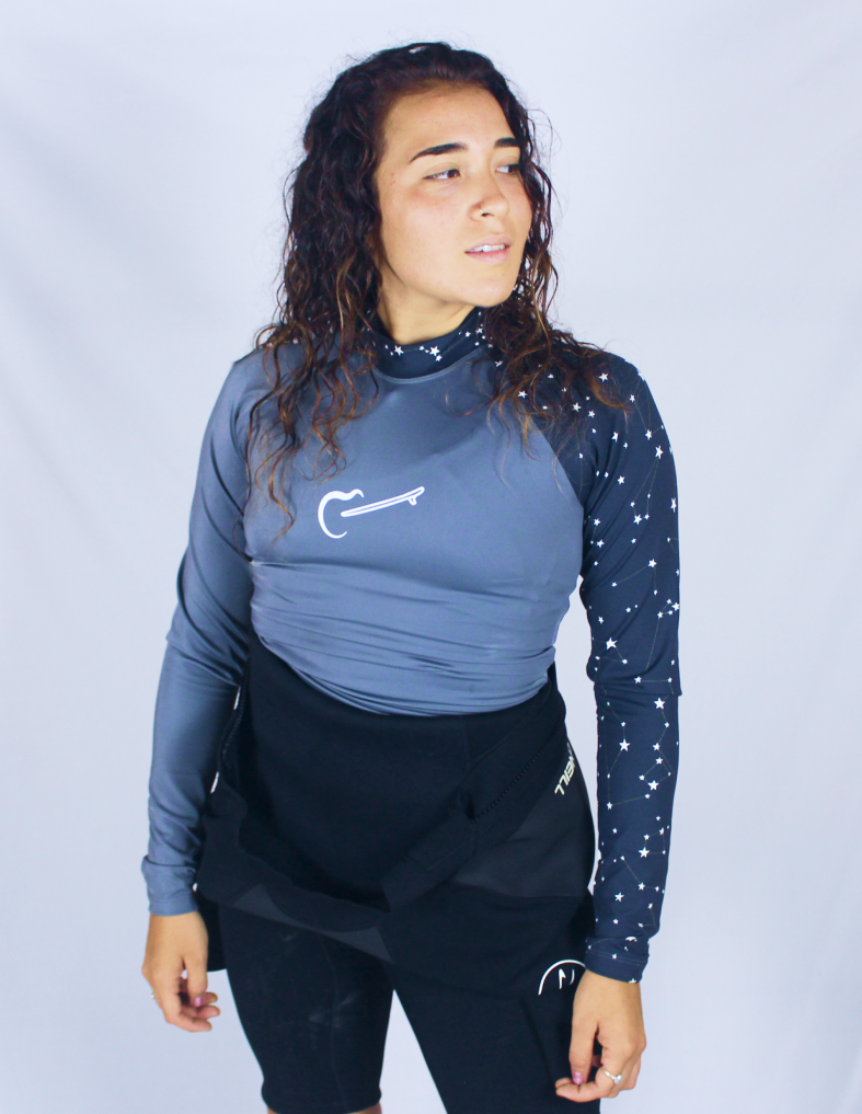 Com mangas longas e tecido de secagem rápida, ela protege sua pele do sol (FPS 50+) e das irritações causadas pelo contato com a prancha ou o neoprene. O design exclusivo com estampa de constelações traz um toque especial que conecta você com o mar e o céu.